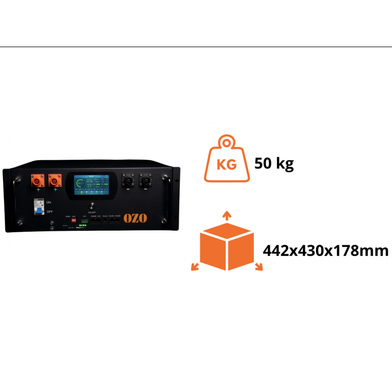 Son format rackable de seulement 50 kg, son installation simple en rack ou au mur, ainsi que son écran LCD intégré permettant le suivi du SOC, SOH, de la tension et de la température des cellules en font une solution modulaire et pratique.