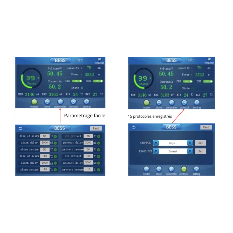 Nos batteries ESS disposent de connecteurs rapides et étanches 200A, doublés pour la mise en parallèle des batteries. Les batteries disposent des protocoles Rj45, CAN, BUS, RS485, qui permettent la communication entre les différents appareils de l'installation. Les connecteurs sont vérrouillables, garantissant une installation stable.