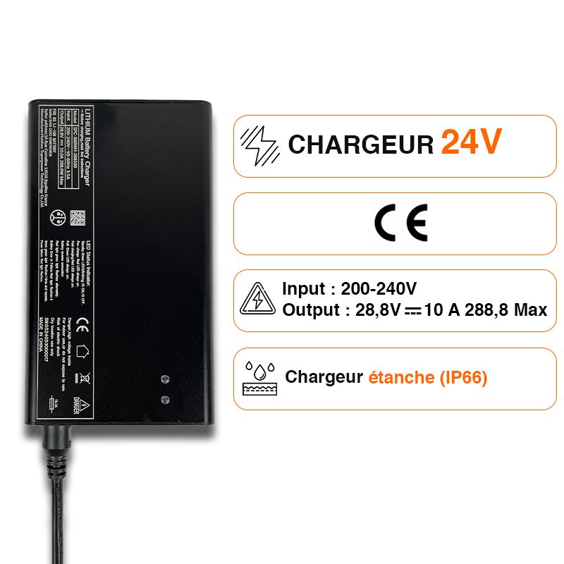 Idéal pour recharger la batterie Lithium 24V de votre chariot PMR, camion, 4x4, scooter...