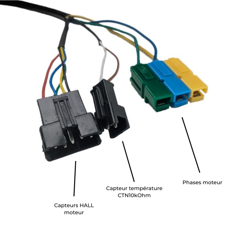 | connecteur moteur | Anderson PP30 pour les phases, JST pour les capteurs et la sonde de température |