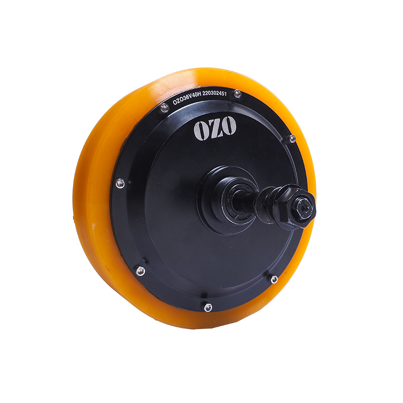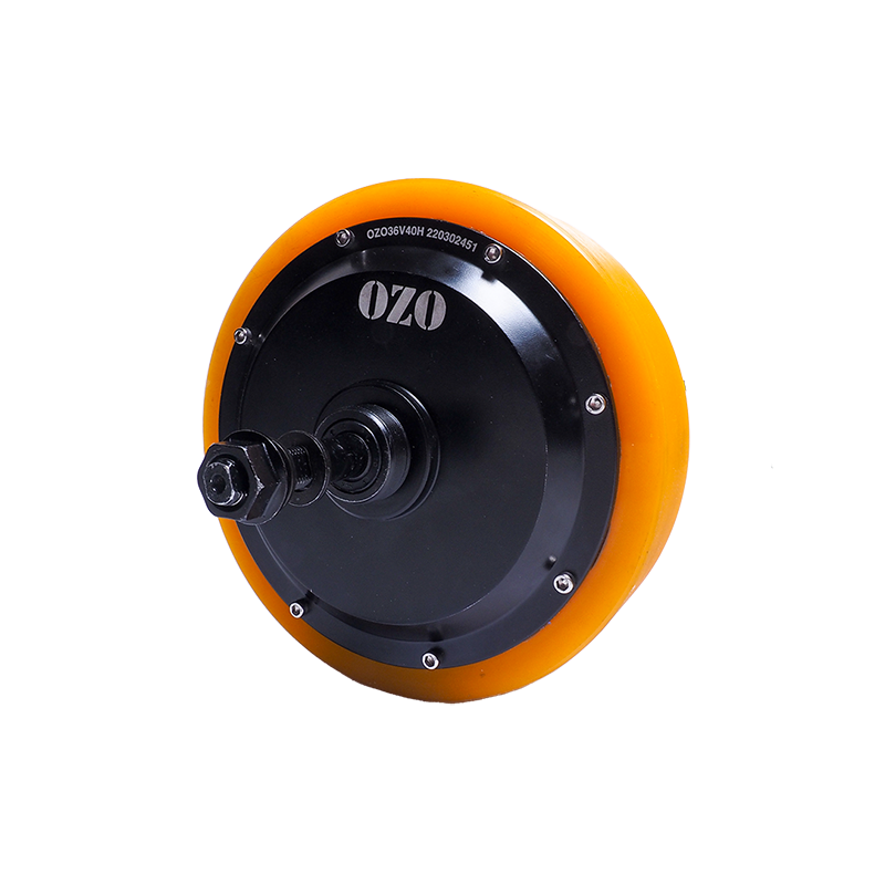 Nous proposons un moteur roue électrique brushless de 220 mm de diamètre disposant d'un bandage en polyurethane.